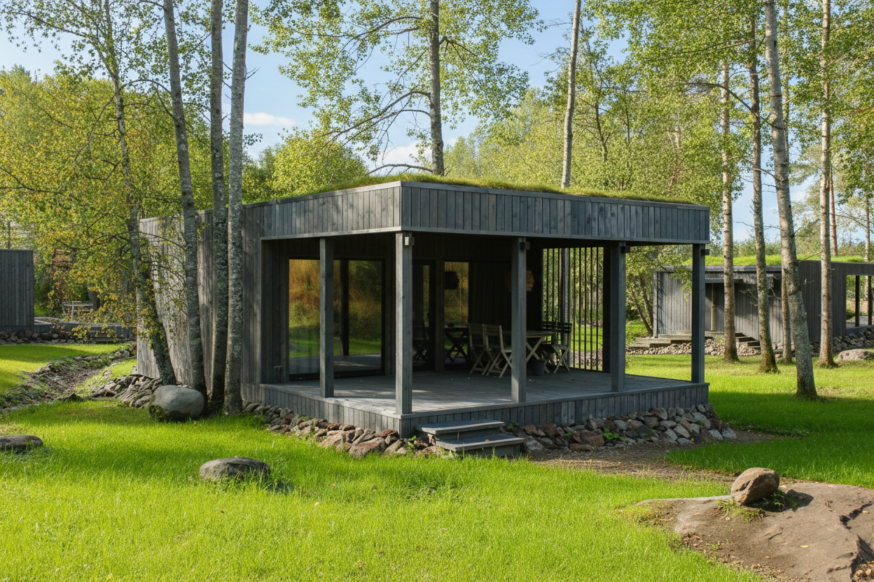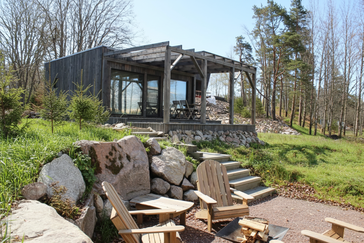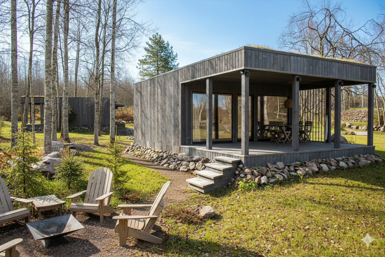 с террасой, видом на озеро и уютным интерьером в темных тонах
